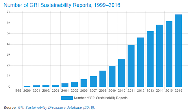 ในหลายประเทศ ได้ผลักดันบริษัทจดทะเบียนและกิจการขนาดใหญ่ ให้จัดทำรายงานแห่งความยั่งยืน ทั้งการออกเป็นข้อกำหนด และให้เป็นไปโดยสมัครใจ โดยจากผลสำรวจของ KPMG ในเรื่องการรายงานความรับผิดชอบของกิจการ ในปี พ.ศ.2560 ระบุว่า ร้อยละ 75 ของบริษัทที่มีขนาดใหญ่สุดในแง่ของรายได้ 250 แห่งของโลก มีการเปิดเผยข้อมูลความยั่งยืน โดยใช้แนวทางการรายงานแห่งความยั่งยืนของ GRI