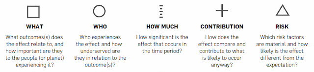 ในมิติ What มีผลลัพธ์อะไรที่สัมพันธ์กับผลที่สร้างขึ้นจากกิจการ และมีความสำคัญอย่างไรต่อผู้คนและโลก ในมิติ Who ใครบ้างที่เป็นผู้ได้รับผล และเป็นกลุ่มผู้ที่ต้องการผลลัพธ์นี้มากน้อยเพียงใด ในมิติ How Much ผลที่เกิดขึ้นในช่วงเวลาดังกล่าวมีนัยสำคัญมากน้อยเพียงใด ในมิติ Contribution กิจการมีส่วนในผลที่เกิดขึ้นมากน้อยเพียงใด และในมิติ Risk มีความเสี่ยงอะไรและอย่างไร (ต่อผู้คนและโลก) หากผลไม่เป็นไปดังหวัง