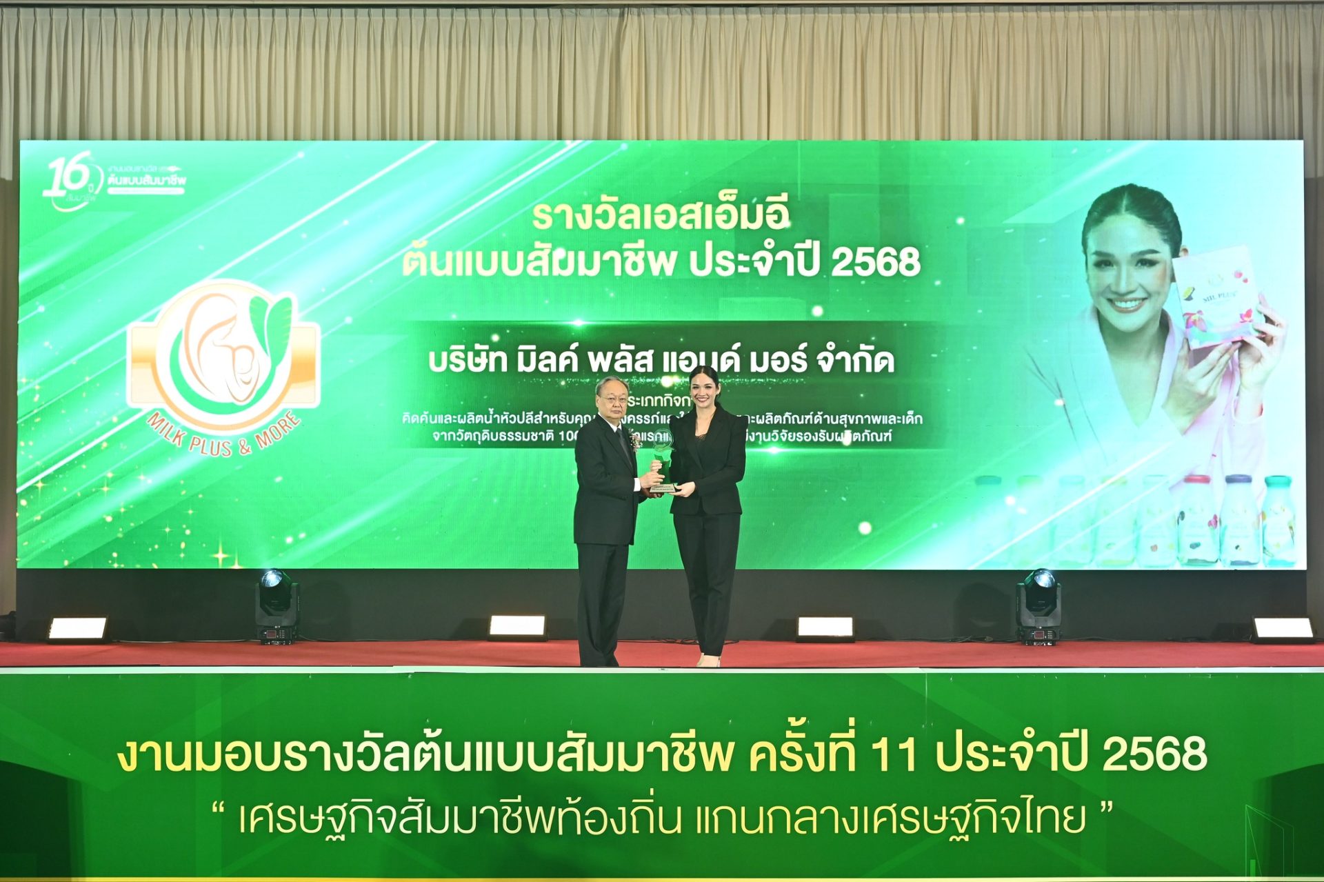 การสนับสนุนการใช้วัตถุดิบในชุมชน พร้อมการมีส่วนร่วมพัฒนาชุมชนในด้านต่างๆ ทำให้มูลนิธิสัมมาชีพ มอบรางวัล เอสเอ็มอีต้นแบบสัมมาชีพ ในปี 2568 ให้กับบริษัทมิลค์ พลัส แอนด์ มอร์ จำกัด เพื่อเป็น “ต้นแบบ” การดำเนินธุรกิจที่เติบโต อย่างมีสัมมาชีพ
