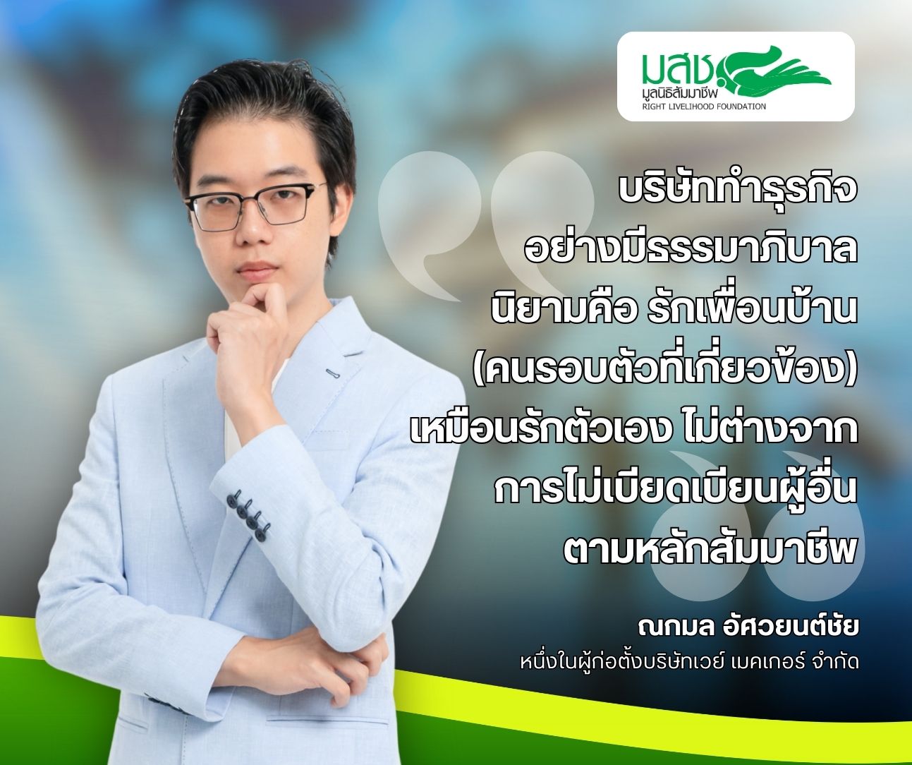 เราจึงอยู่กับองค์กรกันด้วยความสุข ทุกคนที่เกี่ยวข้องรวยหมด ไม่ใช่เจ้าของรวยอยู่คนเดียว ปล่อยให้คนที่เหลือทำงานงกๆ โดนกดขี่จะไม่เกิดขึ้นในบริษัทนี้” ผู้ก่อตั้งบริษัทเวย์ เมคเกอร์ จำกัด เอสเอ็มอีต้นแบบสัมมาชีพปี 2568 กล่าว